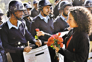 一位巴基斯坦婦女向街頭負責治安的軍警獻花。