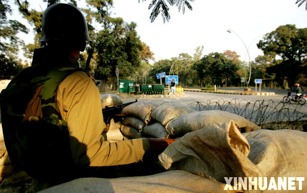 11月18日,巴基斯坦安全人員首都伊斯蘭堡的一個路口警戒。目前,巴基斯坦仍然處于緊急狀態(tài)之中,但首都伊斯蘭堡局勢平靜,居民日常生活基本正常。巴基斯坦總統(tǒng)穆沙拉夫于11月3日宣布全國實行緊急狀態(tài)并頒布了臨時憲法令。新華社記者周磊攝