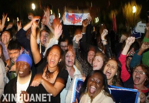 11月5日凌晨,在美國(guó)首都華盛頓的白宮門前,眾多奧巴馬的支持者歡慶奧巴馬當(dāng)選。 11月4日,美國(guó)民主黨總統(tǒng)候選人奧巴馬擊敗共和黨對(duì)手麥凱恩,成功當(dāng)選美國(guó)歷史上第一位非洲裔總統(tǒng)。上萬(wàn)名奧巴馬的支持者隨即從四面八方涌向白宮進(jìn)行慶祝。新華社記者侯俊攝