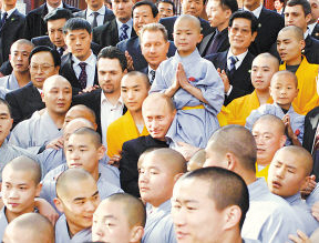 中國日報網(wǎng)站消息:俄羅斯總統(tǒng)普京3月22日在主持方丈釋永信的陪同下造訪了少林寺。看完武僧們的表演后,普京總統(tǒng)說:“我看到了很純正的少林功夫,看到了原汁原味的少林文化,世界上很多武術(shù)都源于此?!?br/>