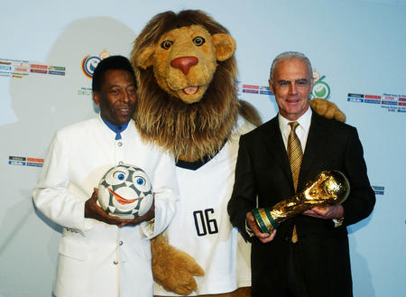 (資料)巴西“球王”貝利(左)和2006年德國(guó)世界杯組委會(huì)主席貝肯鮑爾(右)在德國(guó)萊比錫舉行的新聞發(fā)布會(huì)上,分別手拿2006年世界杯專(zhuān)用球“Pille”和獎(jiǎng)杯,與吉祥物――獅子“Geleo VI”合影。(新華社記者吳曉凌攝 )