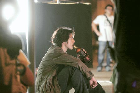 金城武拍攝單獨一人在路邊飲悶酒的戲。