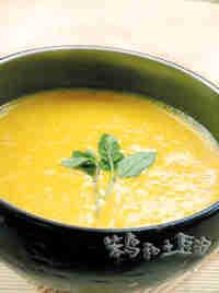 {1}老南瓜切塊,用橄欖油加少許鹽炒一下,和豆?jié){一起攪拌成濃汁,再煮熟即可。
