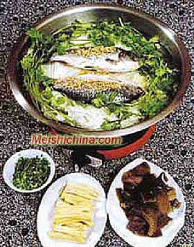 1、將鯽魚去鰓、鱗,剖去內(nèi)臟,片成5厘米見方、0.3厘米厚的魚片(魚刺棄之不用);豬瘦肉去筋膜,洗凈瀝水切片;豆腐切塊;粉條水發(fā)后切段;萵筍葉洗凈擇好。以上各料全部裝盤,圍于火鍋四周。