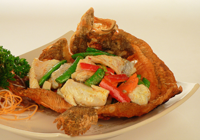 多寶魚去肉,外皮用特制模具加工經(jīng)炸制成船型,用其肉配以多種輔料炒制成菜點(diǎn)綴其間,此道菜外形如乘風(fēng)破浪之寶船,色彩艷麗,口感咸鮮微辣,骨酥肉滑,其外皮酥脆,配以低度白酒小酌,更覺愜意。