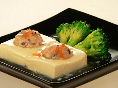 精選蝦肉與漁耕飛魚仔經(jīng)手工打制成滑并制成小丸,配以鮮嫩豆腐、西蘭花經(jīng)蒸制而成,色澤晶瑩如珍珠玉翠,口感清鮮嫩滑,更因此菜為主理廚師獨(dú)創(chuàng)而得名。