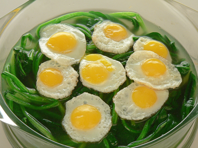 選取菠菜經(jīng)爆炒,配以單面煎鵪鶉蛋,融合密制湯底煲制而成,色澤金黃碧綠,如朵朵黃蓮盛開,口感清爽嫩香,更具滋補(bǔ)之功效。
