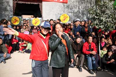 面對(duì)央視的攝像鏡頭,最讓劇組擔(dān)心的就是參賽的農(nóng)民兄弟放不開而造成冷場(chǎng)。不過,現(xiàn)場(chǎng)狀況完全出乎工作人員意料之外。經(jīng)過短暫的明星熱場(chǎng)演唱之后,農(nóng)民秀比賽開始了。先是一個(gè)小伙子登場(chǎng)亮相,嘹亮的嗓音、半專業(yè)的身段一看就知道平時(shí)在k歌場(chǎng)練過。隨后,年齡大小不一性別男女不同的選手輪番出場(chǎng),除了個(gè)別選手有些緊張之外,大多數(shù)人都是輕松自如落落大方,顯示了西北農(nóng)民的豪爽性格。最有意思的是,中午劇組吃飯的房東家大嫂也出場(chǎng)獻(xiàn)上一曲高難度的《青藏高原》。盡管不是很專業(yè),但是聽起來很過癮。因?yàn)檫x手太多,評(píng)委規(guī)定只演唱一段,可是規(guī)定時(shí)間唱完之后,大嫂說:“還有一段,讓我唱完嘛!”然后接著唱,逗得大家前仰后合。一曲歌畢,導(dǎo)演孟欣走過去想接過話筒,可是這位大嫂又發(fā)話了:“你們電視臺(tái)輕易也不來一次,讓我過過癮嘛。我剛才有句話忘詞了,下面我再唱一個(gè)。”一把推開孟欣接著唱。這時(shí),孟欣才意識(shí)到自己遇到了樸實(shí)可愛的農(nóng)民“麥霸”。大嫂的熱情和豪氣瞬間感染了全場(chǎng),一連四首歌都把選秀變了自己的個(gè)唱。