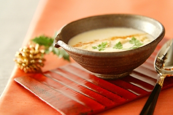 4.過濾后返回鍋中,中火加熱,用鹽調(diào)味,煮開前加入淡奶油,拌勻,熄火;