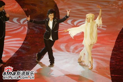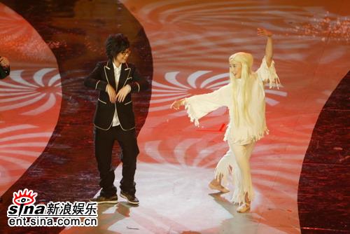 周筆暢演唱《白毛女》時,舞池中翩翩起舞的“喜兒”是2006年《舞林大會》季軍胡靜。表演結(jié)束后,兩人一同登臺串場,周筆暢羨慕胡靜舞技精湛的同時,不慎露出口風(fēng):“我小時候也學(xué)過芭蕾!贝搜砸怀,筆迷陷入瘋狂,尖叫著要求偶像來一段?蓯鄣墓P筆吐舌嘟噥了聲“早知道我不說出來了”,還是乖乖跟著胡靜表演了幾個芭蕾基本手位,雖然不是特別熟練,倒也有板有眼,讓筆迷尖叫連連。主持人問她是否有意參加今年的《舞林大會》,筆筆老老實實地說:“我有想過啊,就是一直沒想好到時候該穿什么服裝!惫P迷則興奮地大叫:“筆筆!國標!恰!”