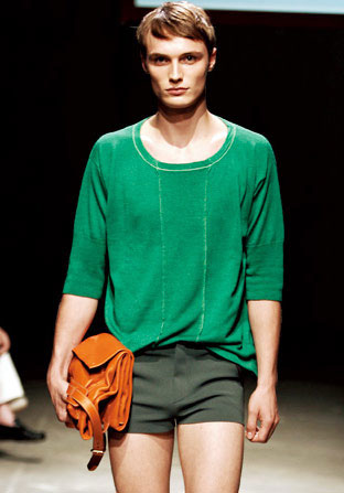 今年并非不流行單肩背的男包,但單肩背包的形狀卻與以前有所不同,以前的都是長(zhǎng)方形單肩包,縱向長(zhǎng)橫向短,今年流行的包卻是橫向發(fā)展,橫邊一定要長(zhǎng)于縱向,最好是個(gè)橫條狀,就算是長(zhǎng)得失去比例也不在乎。把人們觀念中的物件拉長(zhǎng)、壓扁、揉爛,這些都是時(shí)尚的力量。