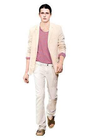 男裝因為款式?jīng)]有女裝多變,所以配飾一直都是強調(diào)品味的一個焦點。春夏配飾中,除了慣有的絲巾、頸鏈、腰帶等物件,還出現(xiàn)了更為彩色的花朵和絲巾等過往鮮有在男裝上搖曳的玩意。圍巾雖然款式上沒有太大變動,但是佩戴方式上也越來越往女性方向靠攏,細長帶流蘇的圍巾松松繞在頸部;把大圍巾扭成麻花狀,圍在胸前;絹質(zhì)長圍巾也成為渲染優(yōu)雅紳士風的重要配件,清新的顏色可以讓暗沉的西服增色許多。