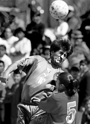 7月15日,在玻利維亞拉巴斯舉行的一場足球友誼賽中,玻利維亞總統(tǒng)莫拉萊斯帶領(lǐng)的總統(tǒng)府足球隊和當(dāng)?shù)氐囊恢幼闱蜿牬笳鼓_技,最后,總統(tǒng)府足球隊以5∶0戰(zhàn)勝了女子足球隊,莫拉萊斯也因在這次比賽中3次進球成了英雄。