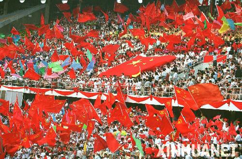 1997年7月1日,首都各界慶祝香港回歸祖國大會在北京工人體育場隆重召開。圖為參加大會的群眾揮動旗幟歡呼慶賀。