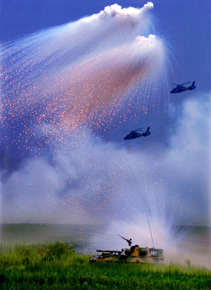 一場(chǎng)毫無(wú)征兆的大雨,遮蔽了豫西南演兵場(chǎng)。望遠(yuǎn)鏡中,強(qiáng)擊機(jī)、直升機(jī)射出的導(dǎo)彈和榴彈炮、火箭炮發(fā)射的炮彈交織在一起,在雨中原野形成一片恐怖的死亡地帶。