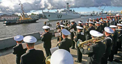 8月27日,在俄羅斯的圣彼得堡市,俄方歡迎抵達(dá)的中國(guó)海軍艦艇編隊(duì)。