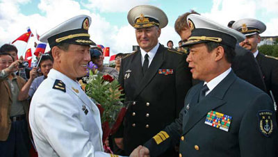 8月27日,在俄羅斯的圣彼得堡市,中國(guó)人民解放軍海軍副政委鄔華揚(yáng)中將(前右)與俄羅斯列寧格勒海軍基地司令員利平斯基海軍少將(中)歡迎中國(guó)海軍艦艇編隊(duì)總指揮、中國(guó)人民解放軍海軍南海艦隊(duì)副司令員蘇支前少將(前左)。