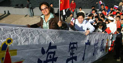 8月27日,在俄羅斯的圣彼得堡市,當(dāng)?shù)厝A人華僑代表登上剛剛抵達(dá)的中國(guó)海軍“廣州”號(hào)導(dǎo)彈驅(qū)逐艦參觀。