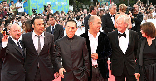 8月29日,在意大利北部城市威尼斯,第64屆威尼斯電影節(jié)評(píng)審團(tuán)主席、中國導(dǎo)演張藝謀(前左三)與其他評(píng)委共同出席電影節(jié)開幕式。新華社記者謝秀棟攝