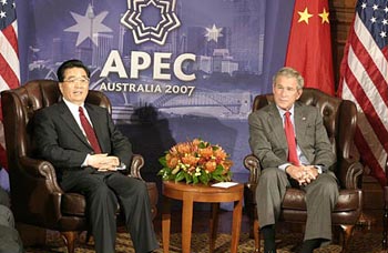 中國(guó)日?qǐng)?bào)網(wǎng)環(huán)球在線消息:中國(guó)國(guó)家主席胡錦濤9月6日在悉尼會(huì)見美國(guó)總統(tǒng)布什,一番長(zhǎng)談后共同會(huì)見記者。臺(tái)灣媒體指出,從胡布兩人對(duì)臺(tái)灣問題“一致默契”的發(fā)言來看,陳水扁眼前的危機(jī)不僅沒有解除,反而焦慮只會(huì)更加沉重。