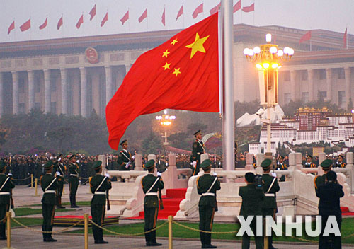 資料圖片:2006年10月1日清晨,來自全國各地的20余萬名群眾在北京天安門廣場觀看升國旗儀式,祝福祖國更美好。