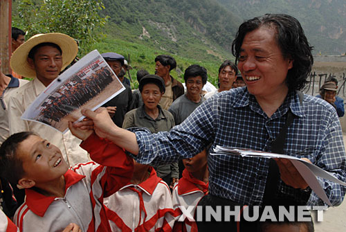 林強(qiáng)在向阿布洛哈村的孩子們分發(fā)他拍攝的照片(2007年7月15日攝)。2005年3月以來,軍轉(zhuǎn)干部、四川省語委辦主任林強(qiáng)先后10次默默進(jìn)入偏僻的涼山州布拖縣烏依鄉(xiāng)阿布洛哈村,無私地幫助這個(gè)“麻風(fēng)村”的村民。在他的奔走下,阿布洛哈村建起了歷史上第一所學(xué)校――林川希望小學(xué);他捐款兩萬元,拓寬了村里與外面聯(lián)系的一條狹窄山路……