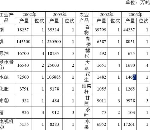 2003-2006年,我國主要工業(yè)產(chǎn)品產(chǎn)量均大幅增加;居世界的位次也基本保持在前列。其中,煤、水泥和化肥產(chǎn)量連續(xù)四年居世界第1位。鋼、發(fā)電量和布的產(chǎn)量也基本保持在世界前2位;原油產(chǎn)量居世界第5位。