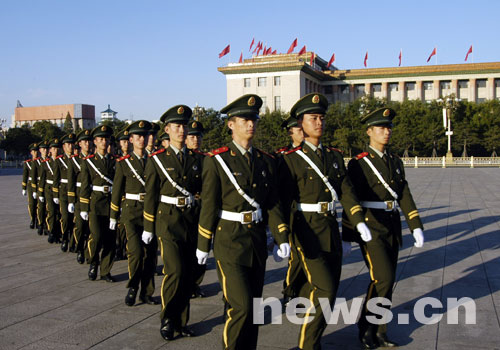 中國(guó)共產(chǎn)黨第十七次全國(guó)代表大會(huì)開(kāi)幕式定于2007年10月15日9:00在人民大會(huì)堂大禮堂舉行。圖為一隊(duì)執(zhí)勤官兵走在人民大會(huì)堂門前的天安門廣場(chǎng)上。新華網(wǎng)榮忠霞 攝