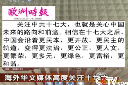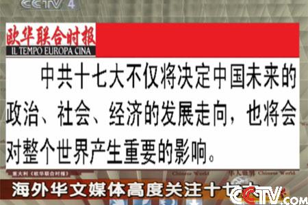 意大利《歐華聯(lián)合時報》說,定于10月15日開幕的中國共產(chǎn)黨第十七次代表大會不僅將決定中國未來的政治、社會、經(jīng)濟的發(fā)展走向,也將會對整個世界產(chǎn)生重要的影響。另外,西班牙的《歐華報》,比利時的《華商時報》,德國的《歐洲商旅報》等都將推出了十七大專版,我們也會在節(jié)目中繼續(xù)為您報道海外華文媒體對此次大會的精彩評論。(來源:CCTV.com 編輯:肖亭)