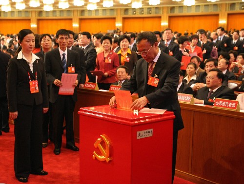 10月21日,中國共產(chǎn)黨第十七次全國代表大會閉幕會在北京人民大會堂舉行。這是代表投票選舉中央委員會委員、候補(bǔ)委員和中央紀(jì)律檢查委員會委員。新華社記者 馬占成 攝