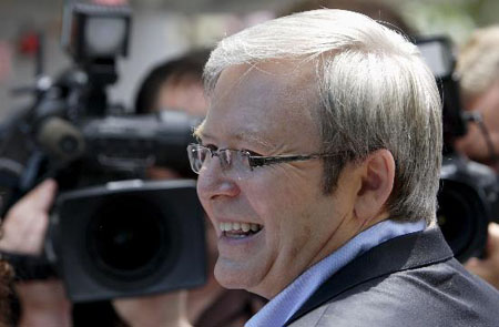 澳大利亞工黨領(lǐng)導(dǎo)人陸克文投票后微笑面對媒體。新華社記者 張軍攝