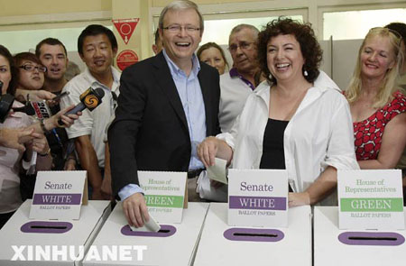 澳大利亞最大政黨工黨領(lǐng)導(dǎo)人陸克文與妻子在昆士蘭州首府布里斯班投票