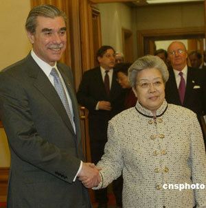 2006年3月28日,中國國務(wù)院副總理吳儀在北京中南海會見美國商務(wù)部長古鐵雷斯。