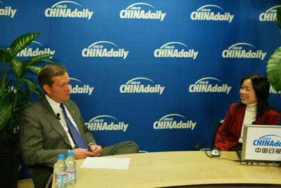 2007年12月10日上午,美國衛(wèi)生部長萊維特(左)在中國日報網(wǎng)站與網(wǎng)民對話