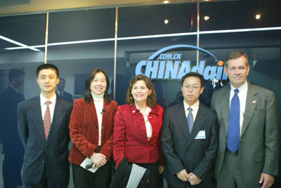 2007年12月10日上午,美國(guó)衛(wèi)生部長(zhǎng)萊維特先生做客中國(guó)日?qǐng)?bào)網(wǎng),成功結(jié)束訪談后合影留念。從右至左依次為:美國(guó)衛(wèi)生部長(zhǎng)萊維特先生、中國(guó)日?qǐng)?bào)網(wǎng)副總編輯趙煥新先生、萊維特夫人、此次訪談主持人黎星女士、中國(guó)日?qǐng)?bào)網(wǎng)總裁高岸明先生。