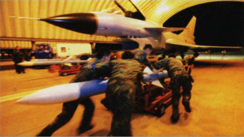 機棚前,各種保障車輛快速而有序地穿梭忙碌著,彈藥在戰(zhàn)機前一字排開,銀灰色的彈面在燈光的照射下泛出幽幽的冷光?!皽?zhǔn)備加掛!”對講機中傳出副大隊長方明簡潔的口令?!皽?zhǔn)備好!”回應(yīng)此起彼伏?!伴_始!”一聲令下,所有的機組幾乎是同一個動作。拖彈入位,“好!”準(zhǔn)備掛彈,“好!”起!機務(wù)人員的應(yīng)答聲像是有力的沖擊波,激蕩著機棚中的空氣,一枚枚導(dǎo)彈、炸彈頃刻間躍上了掛架,驕傲地昂起了它們的頭。二十余分鐘后,戰(zhàn)機的充、填、加、掛等出動準(zhǔn)備工作全部完成,信號員堅定地舉起了手中的旗,為披掛整齊的戰(zhàn)鷹送行。