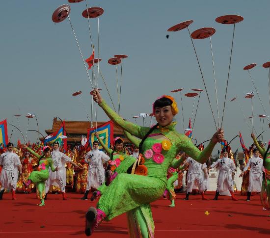3月31日,北京2008年奧運(yùn)會(huì)圣火歡迎儀式暨火炬接力啟動(dòng)儀式在天安門廣場(chǎng)舉行。這是儀式開始前的文藝表演。新華社記者李學(xué)仁攝(來(lái)源:新華網(wǎng))