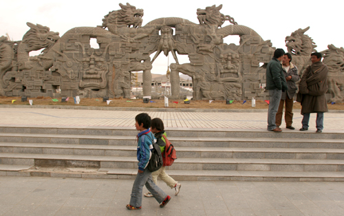孩子們穿過民族團結(jié)廣場去上學(xué)。 攝影:中國日報記者 姜東