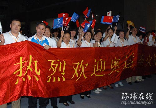 4月18日,中國使館工作人員在機(jī)場熱烈歡迎奧運(yùn)圣火的到來。當(dāng)日,運(yùn)送北京奧運(yùn)圣火的專機(jī)從印度新德里飛抵奧運(yùn)火炬境外傳遞的第12站――泰國首都曼谷。 新華社記者公磊攝