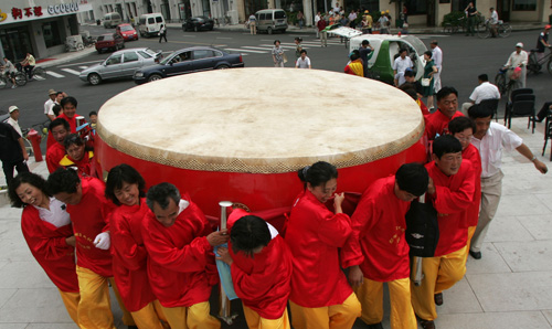 6月28日,天津“都市風(fēng)雷大鼓隊”在和平區(qū)小白樓音樂廳前廣場演練迎奧運系列鼓曲。奧運火炬8月初在天津傳遞期間,由60名隊員組成的大鼓隊將為火炬手加油助威。 新華社發(fā)(趙建偉 攝)