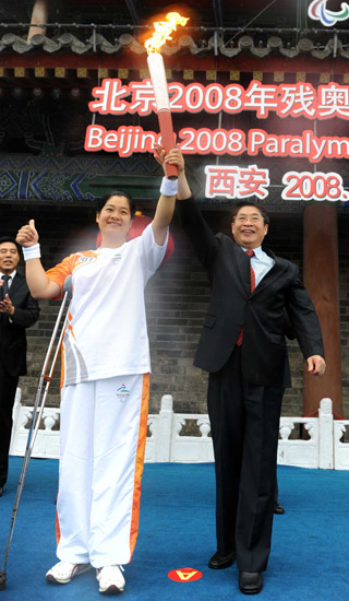 今天上午九時(shí)許,隨著首棒火炬手、全國(guó)殘疾人十佳運(yùn)動(dòng)員、自學(xué)成才標(biāo)兵的張輝高擎“祥云”火炬跑出設(shè)在西安市東門城墻城樓的起跑點(diǎn),北京殘奧會(huì)火炬?zhèn)鬟f“中華文明線”首站西安站正式拉開帷幕。