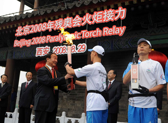 8月29日,北京奧組委執(zhí)行副主席蔣效愚(前左)接過火炬。當(dāng)日,北京殘奧會(huì)圣火在西安進(jìn)行傳遞。 新華社記者金良快攝