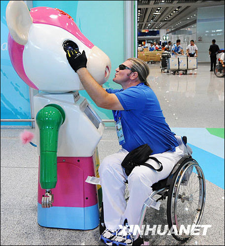 當(dāng)日,由中國(guó)民航大學(xué)機(jī)器人研究所研制的以殘奧會(huì)吉祥物“福牛樂(lè)樂(lè)”為形象的機(jī)器人在北京首都國(guó)際機(jī)場(chǎng)T3航站樓亮相,正式加入殘奧會(huì)服務(wù)行列。這款專(zhuān)門(mén)為殘奧會(huì)制作的機(jī)器人與先前的福娃機(jī)器人一樣,集成了智能機(jī)器人領(lǐng)域的多項(xiàng)最新研究成果。它不僅外型漂亮精干,還具有先進(jìn)的視覺(jué)處理判斷能力,并能夠進(jìn)行雙向語(yǔ)音信息交流。更重要的是,他還懂簡(jiǎn)單的手語(yǔ)問(wèn)候,可以和聾啞朋友進(jìn)行簡(jiǎn)單溝通。新華社記者劉海峰攝