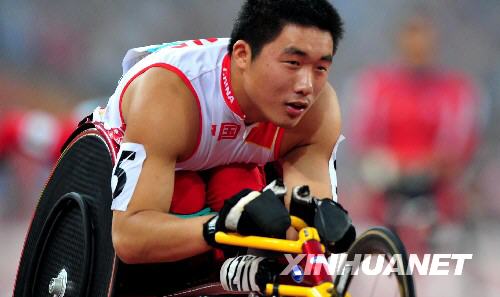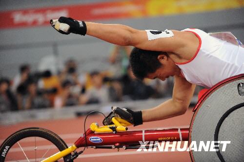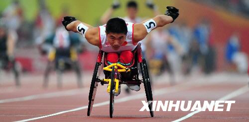 9月9日,中國(guó)隊(duì)最后一棒選手李虎召在比賽中沖刺。當(dāng)日,在國(guó)家體育場(chǎng)進(jìn)行的北京2008年殘奧會(huì)男子4X100米T53/T54級(jí)決賽中,中國(guó)隊(duì)以49秒90的成績(jī)獲得金牌。新華社記者杜華舉攝