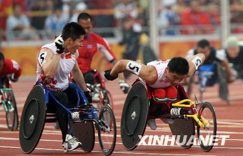 9月9日,中國(guó)選手李虎召在沖過(guò)終點(diǎn)后慶祝。當(dāng)日,在國(guó)家體育場(chǎng)進(jìn)行的北京2008年殘奧會(huì)男子4X100米接力T53/T54級(jí)決賽中,中國(guó)隊(duì)以49秒90的成績(jī)奪冠。新華社記者李尕?cái)z