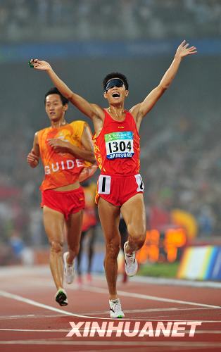 9月9日,中國選手張振在沖過終點后慶祝。當日,在國家體育場進行的北京2008年殘奧會男子5000米T11級決賽中,張振以15分27秒35的成績奪冠。新華社記者李尕攝