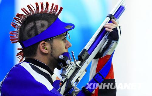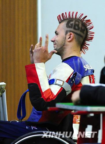 9月11日,英國(guó)選手馬特·斯克爾霍恩在賽后慶祝勝利。當(dāng)日,在北京2008年殘奧會(huì)R3混合組10米氣步槍臥射--SH1決賽中,馬特·斯克爾霍恩以704.9環(huán)的總成績(jī)獲得冠軍。 新華社記者任勇攝