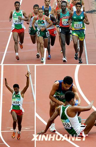 9月13日,在國(guó)家體育場(chǎng)“鳥巢”舉行的男子5000米T46級(jí)決賽中,埃塞俄比亞選手赫布在體力不支的情況下,堅(jiān)持跑完全程后,席地而倒,巴西選手塞納連忙將其扶起并遞上清水。 新華社記者陶明攝
