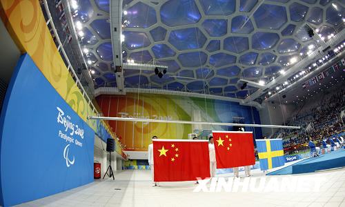 9月15日,在S6級(jí)男子50米自由泳決賽頒獎(jiǎng)儀式上,中國(guó)國(guó)旗與瑞典國(guó)旗同時(shí)升起。當(dāng)日,在國(guó)家游泳中心——“水立方”進(jìn)行的北京2008年殘奧會(huì)游泳比賽收官。至此,“水立方”送走了北京奧運(yùn)會(huì)與北京殘奧會(huì),完美謝幕。新華社記者丁旭攝