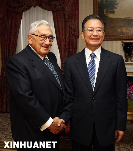 9月23日,中國(guó)國(guó)務(wù)院總理溫家寶在美國(guó)紐約會(huì)見美國(guó)前國(guó)務(wù)卿基辛格。 新華社記者姚大偉攝